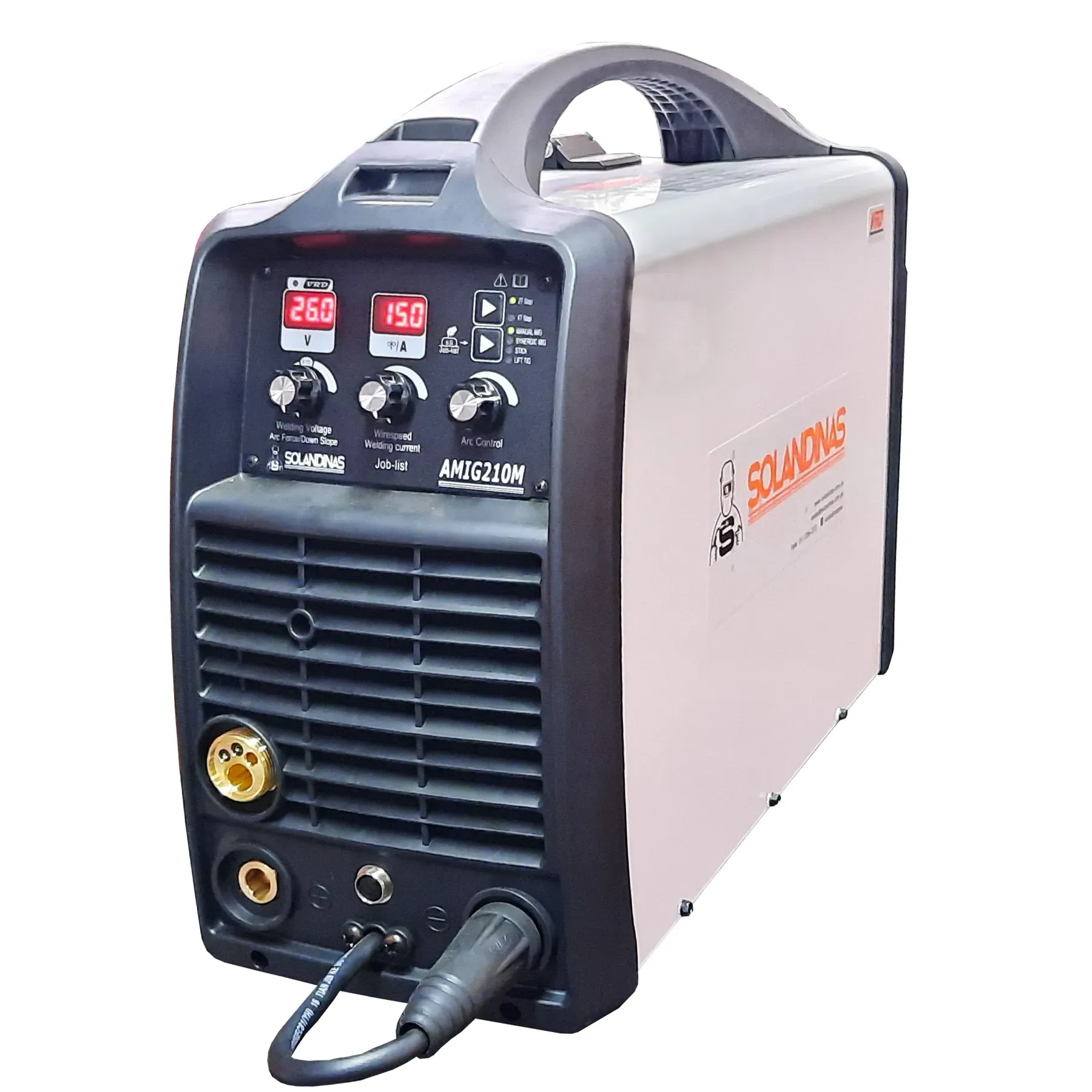 Brinda 210 amperios para soldadura MIG, ideal para trabajos livianos y semi industriales. Suelda alambres tubulares auto protegidos que no utilizan gas de protección.